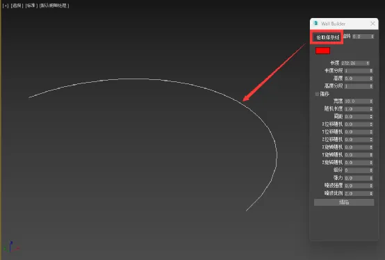 2.打开3DMAX一键快速生成砖墙插件WallBuilder,按下“拾取样条线”按钮,然后,在3dmax视口中选择绘制的样条线路径(弧线)。