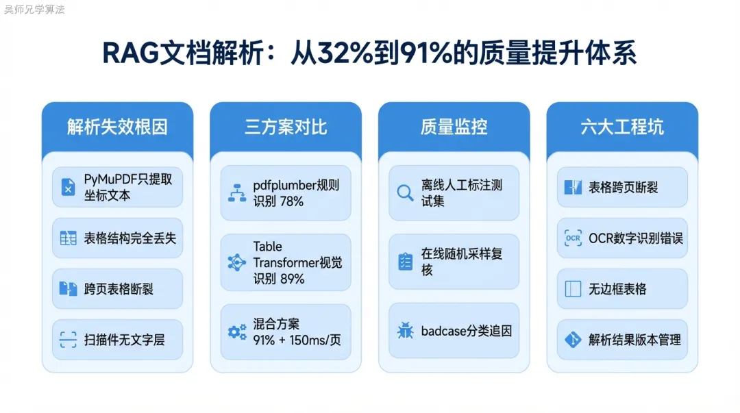 文档解析是 RAG 系统里”做好了用户感知不到,做差了用户问什么都答不对”的基础模块。把这个环节从”三行代码提取文本”升级到”混合解析方案 + 双重质量监控”,从 32% 准确率提升到 91%——这背后是真实的工程投入,也是面试里能和其他候选人拉开差距的地方。
