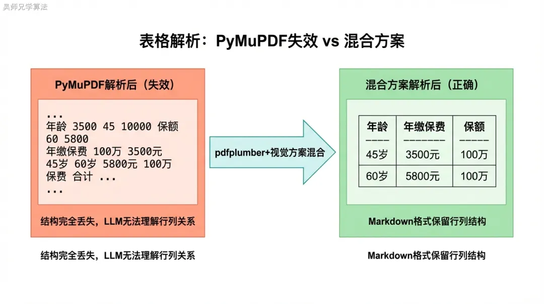 PDF 里的表格本质上是一堆”在特定坐标位置放置文字”的指令集——”45 岁”放在 (120, 340),”3500 元”放在 (280, 340),”年缴”放在 (280, 280)。没有任何语义标记说”这是一张费率表”,更没有说”这两个单元格在同一行”。PyMuPDF 按坐标顺序提取,同一行的”45 岁”和”3500 元”可能被分到不同行,”年缴”表头可能被插入到数据中间。