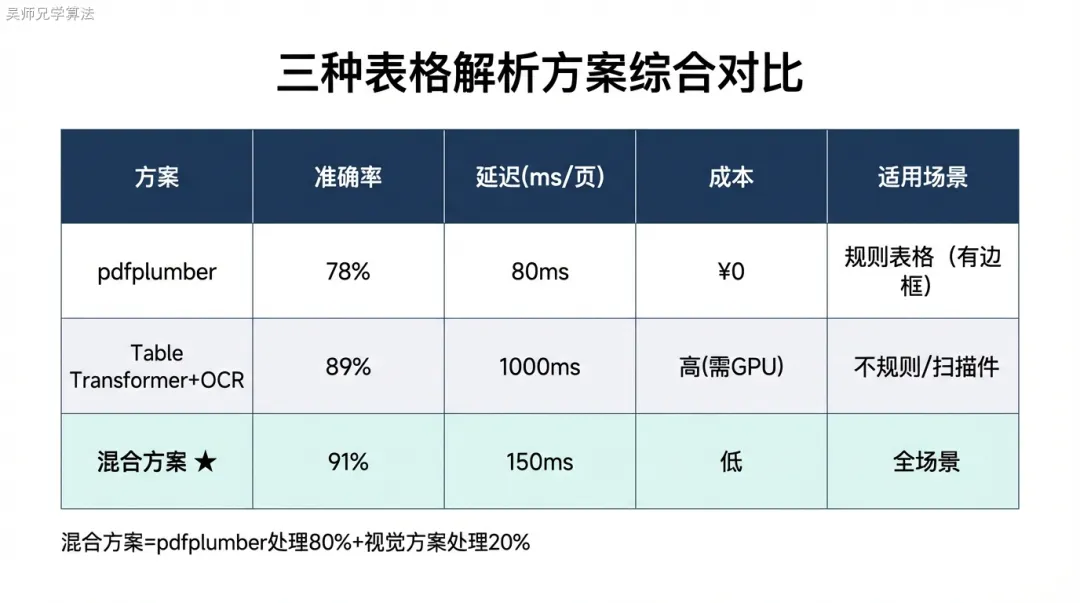 pdfplumber 规则识别到 78%,速度快但无法处理无边框和扫描件;Table Transformer 视觉识别到 89%,速度慢需要 GPU;混合方案用质量检查函数做路由,80% 走 pdfplumber,20% 降级到视觉,最终 91% 准确率、150ms/页均衡延迟。