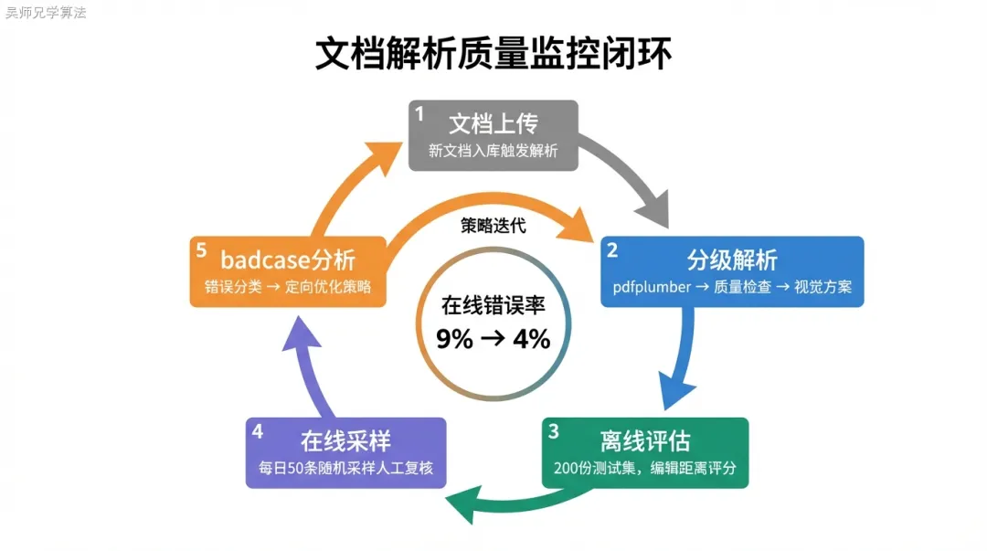 离线 200 份人工标注测试集做持续评估,在线每天随机抽 50 个查询做采样复核。在线监控发现了三类离线没覆盖的问题:扫描件、特殊字符、多语言表格,针对性优化后在线错误率从 9% 降到 4%。强调:光有离线指标不够,线上文档格式千变万化。