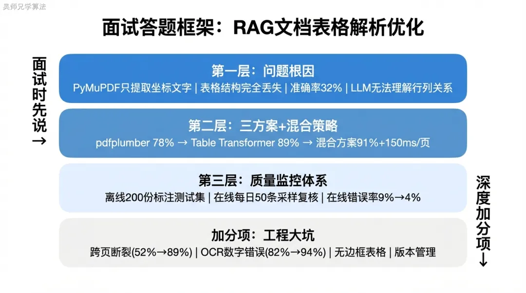 这道题的考察逻辑是:你是否真正关注过 RAG 系统的”第一公里”——文档内容本身的质量。解析错了,后面做得再好都是在错误的基础上优化。