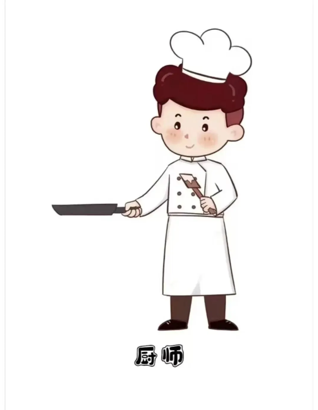 • 👩🍳厨师:夸张的厨师帽顶着彩虹糖霜,锅铲翻飞出“煎炒烹炸”书法字