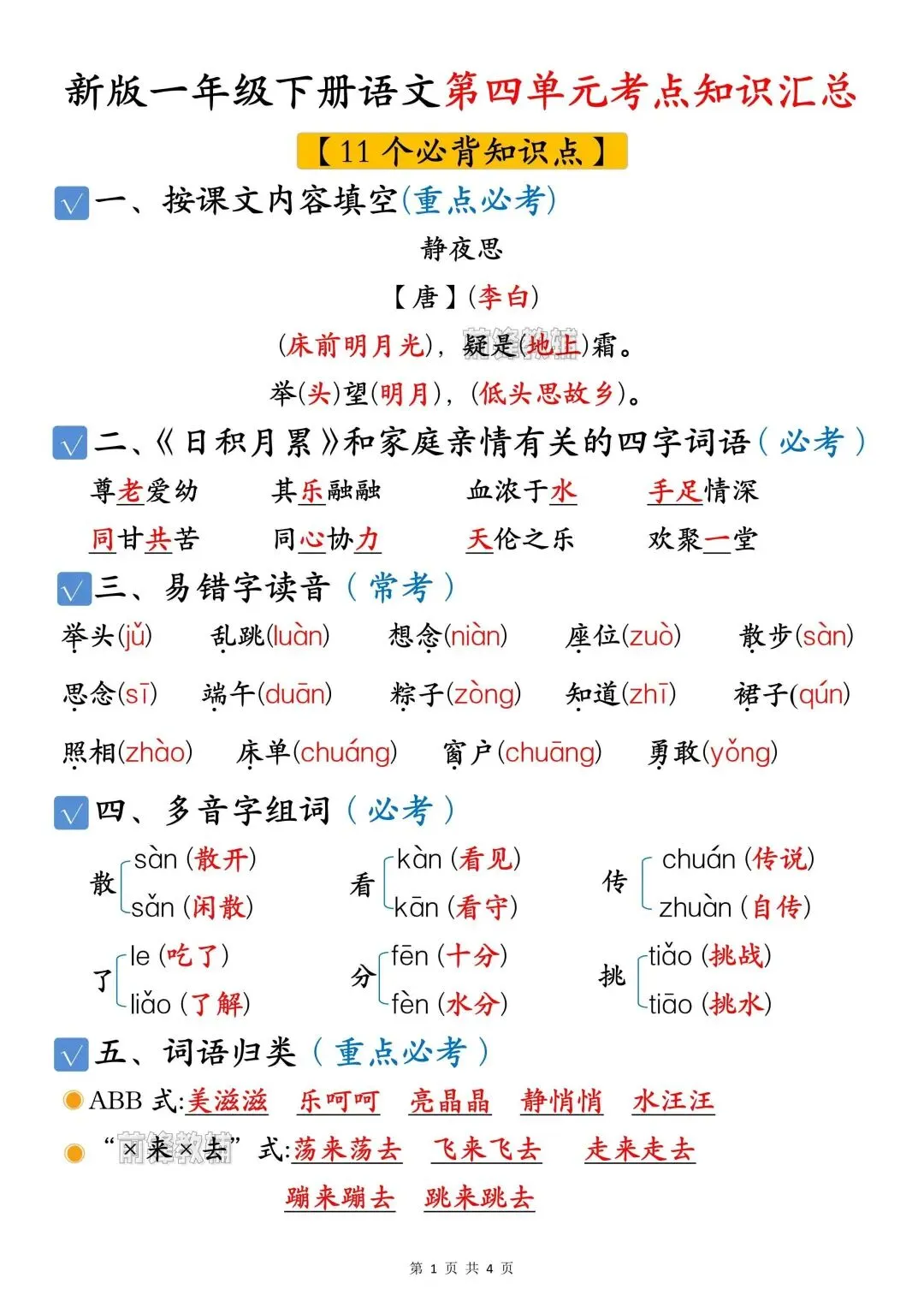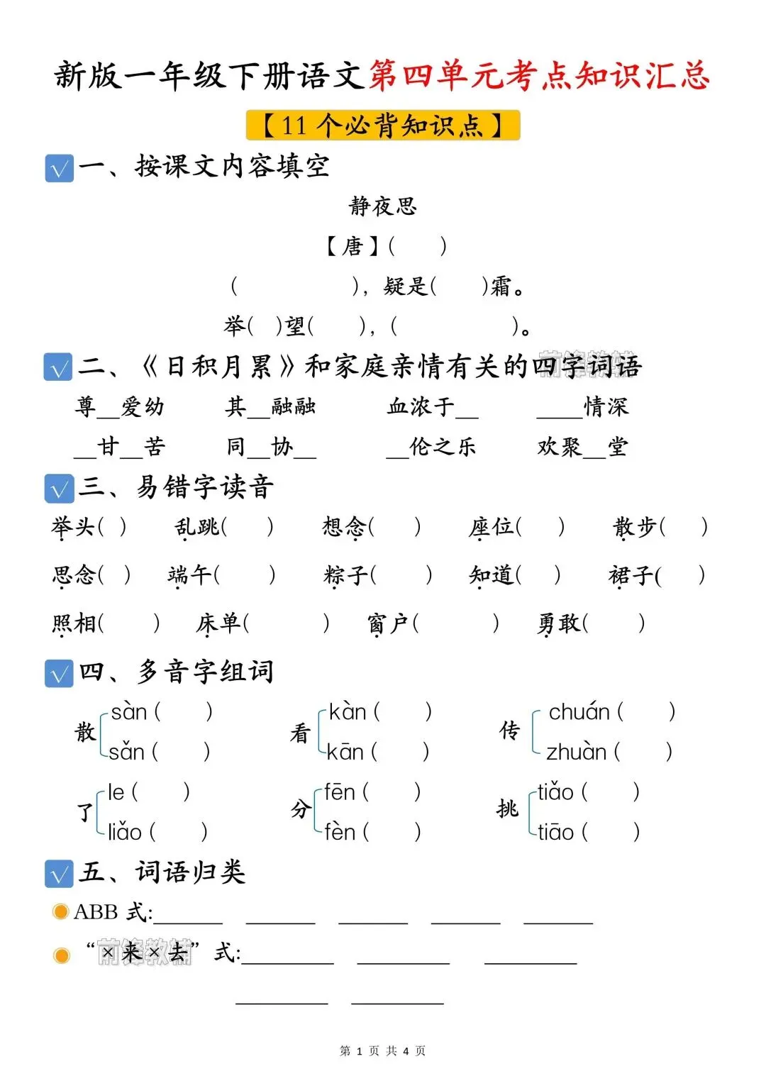 一年级下册语文第四单元可打印|考点知识汇总+空白页练习(26春版)