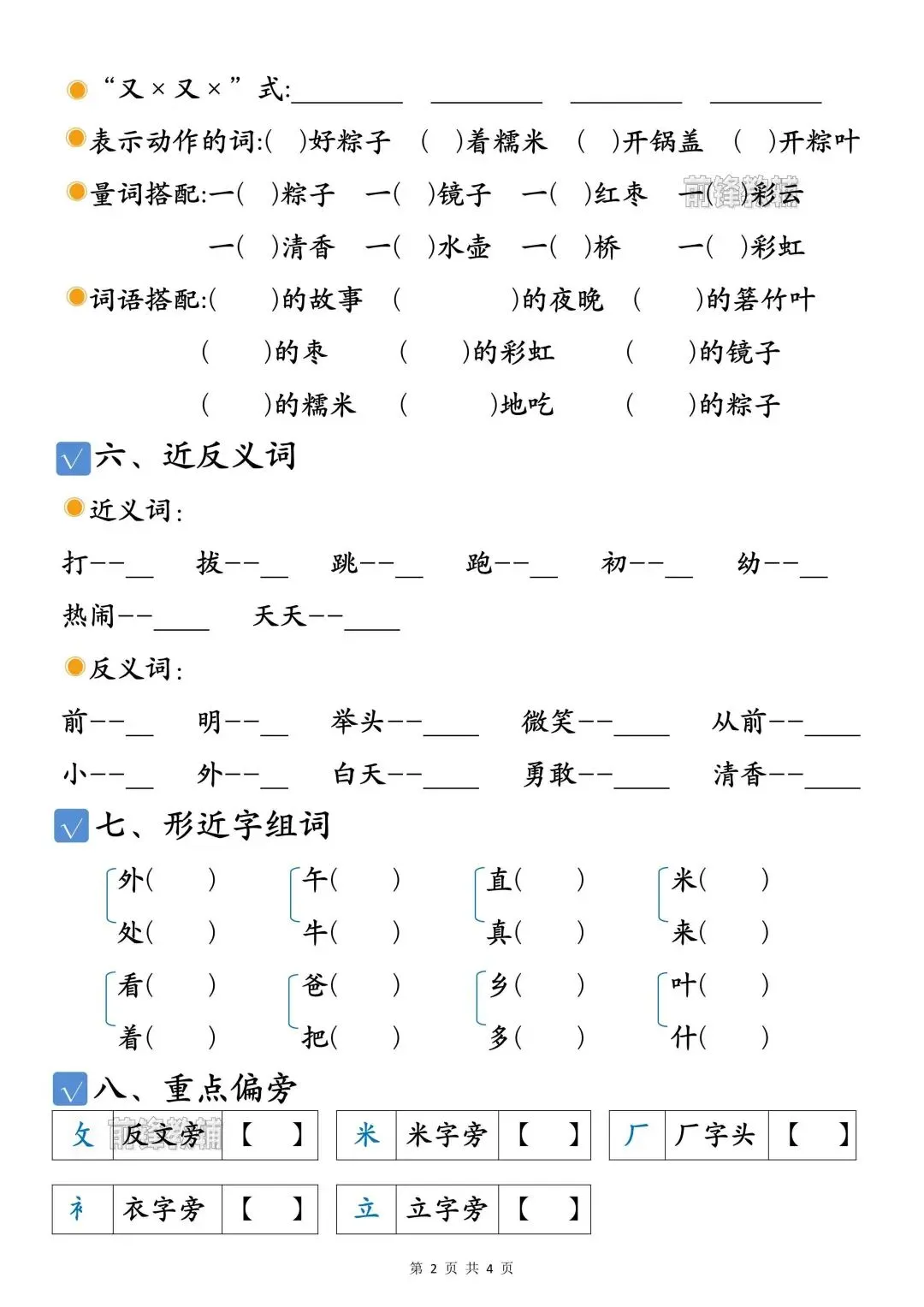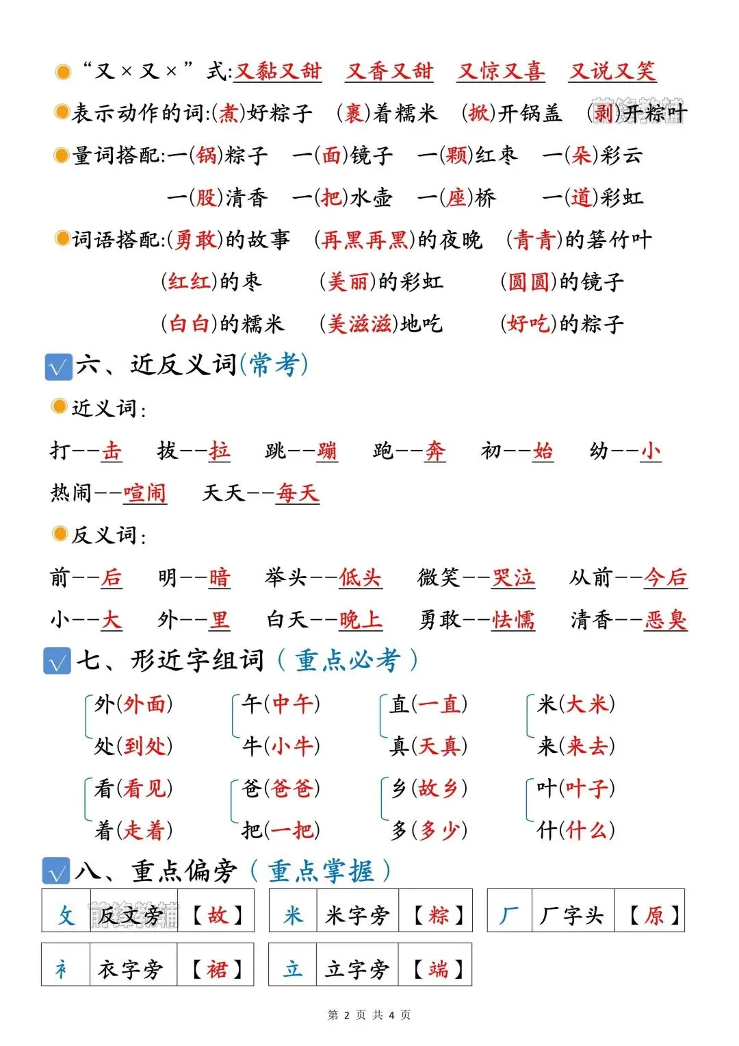 古诗《静夜思》的默写、与亲情相关的四字词语(如“尊老爱幼”)、易错字音(如“粽子”“勇敢”)及多音字组词。词语方面需掌握ABB式(美滋滋)、“来去”式及量词搭配。句型上重点仿写“一……就……”和“十分”句式。