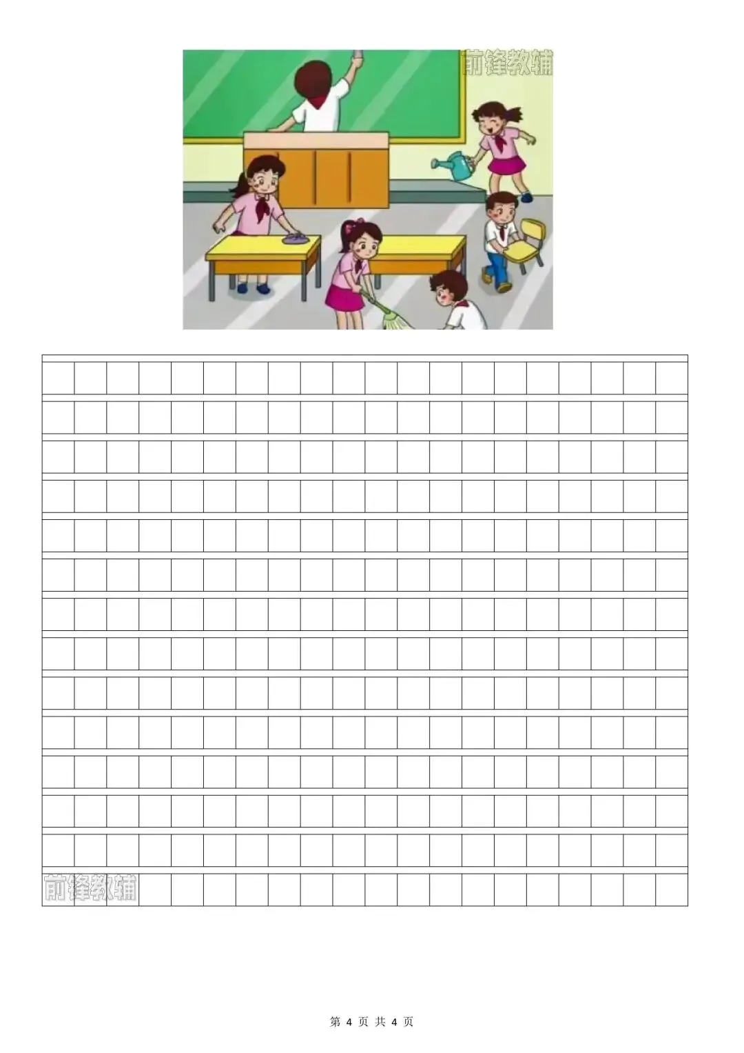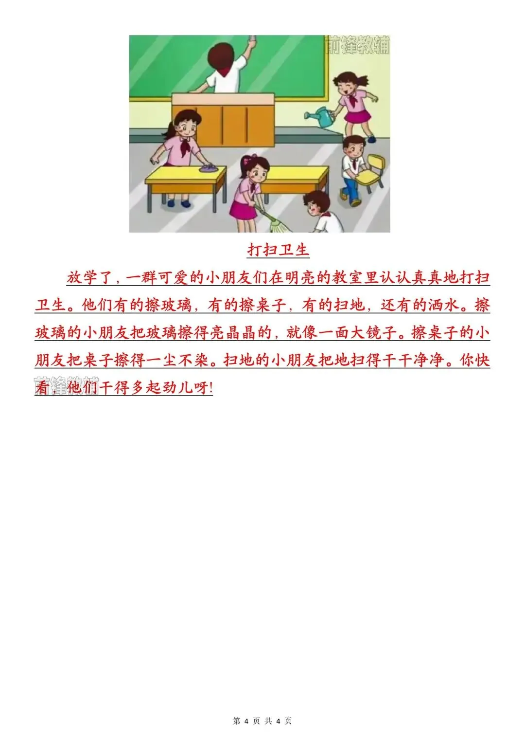 此外,近反义词、形近字、偏旁识别及看图写话《打扫卫生》也是必考内容。