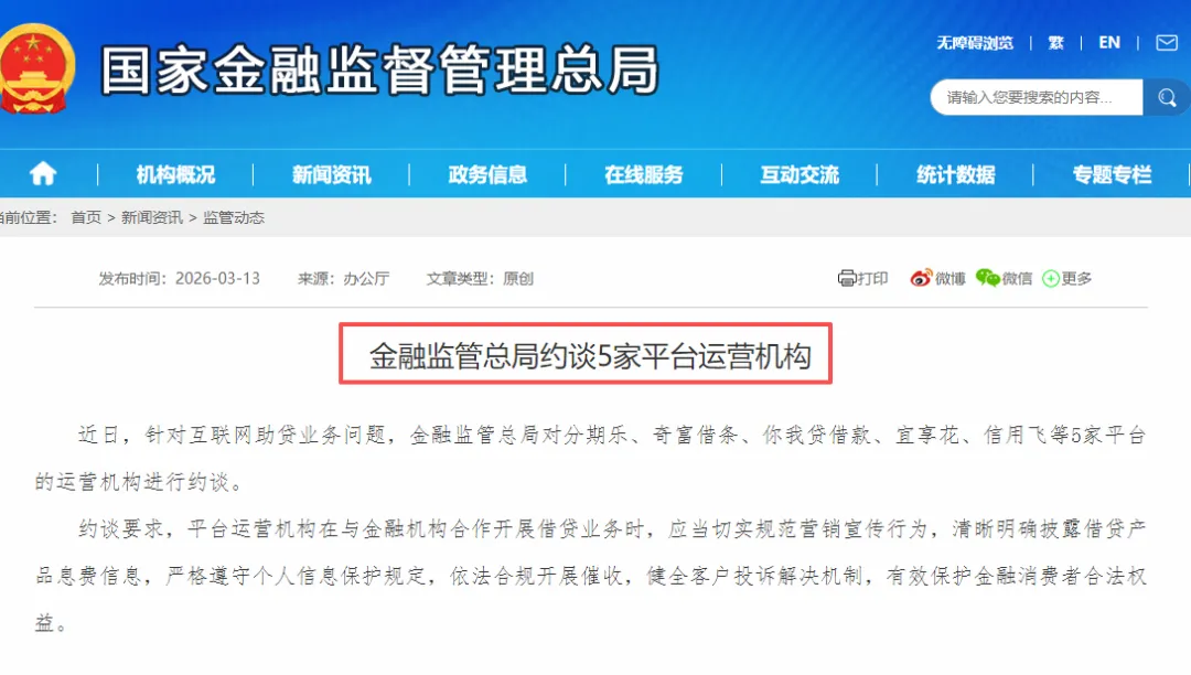 近期,国家金融监督管理总局约谈了5家助贷平台及6家出行平台,直指金融业务营销不规范、息费披露不清等问题;今年3月,两部门联合发布新规,明确要求个人贷款业务必须明示综合融资成本,全面列明各项息费及收取标准,从源头遏制乱象。