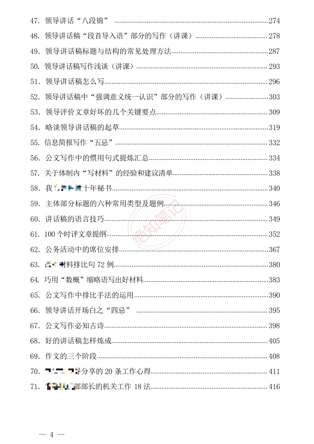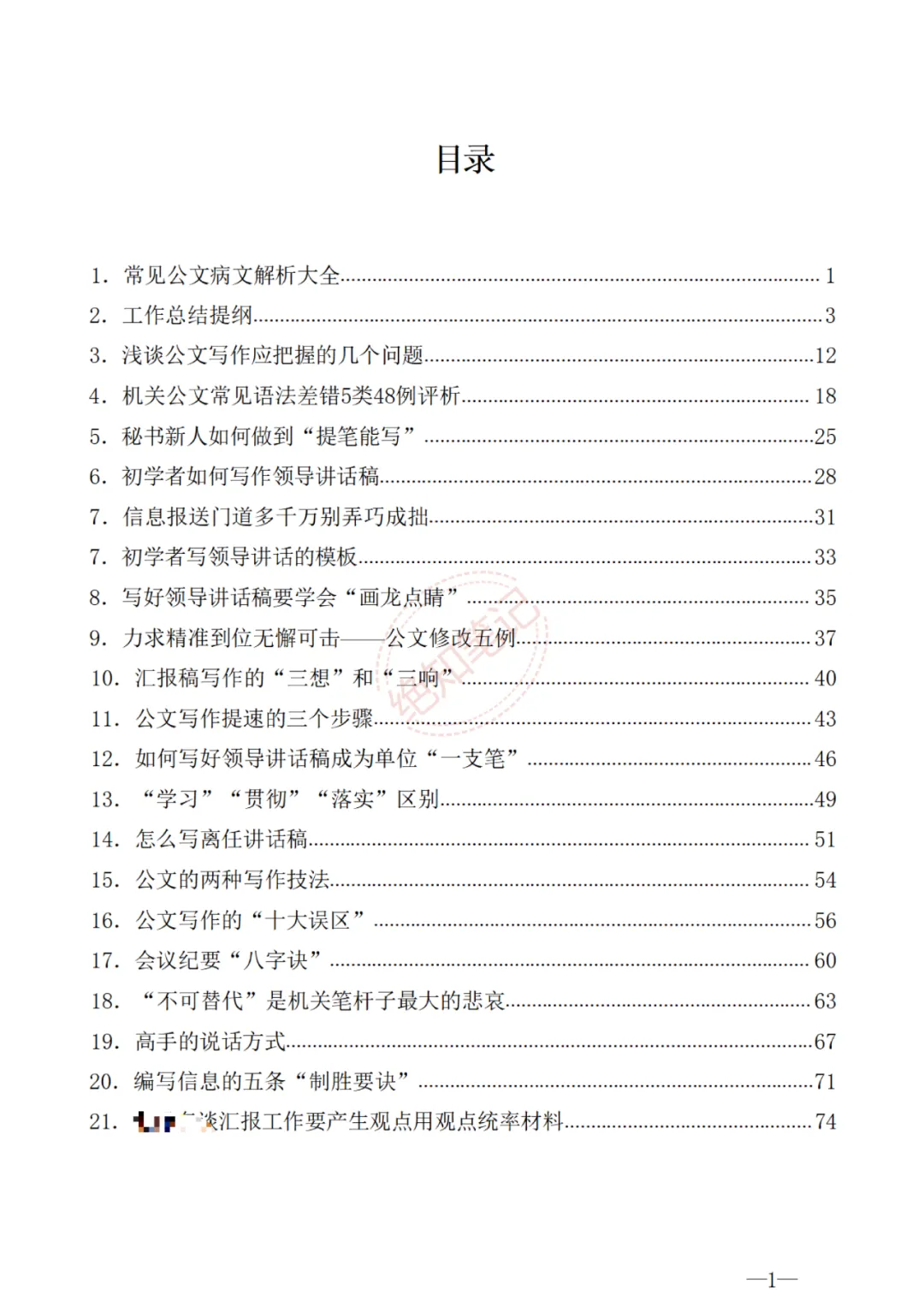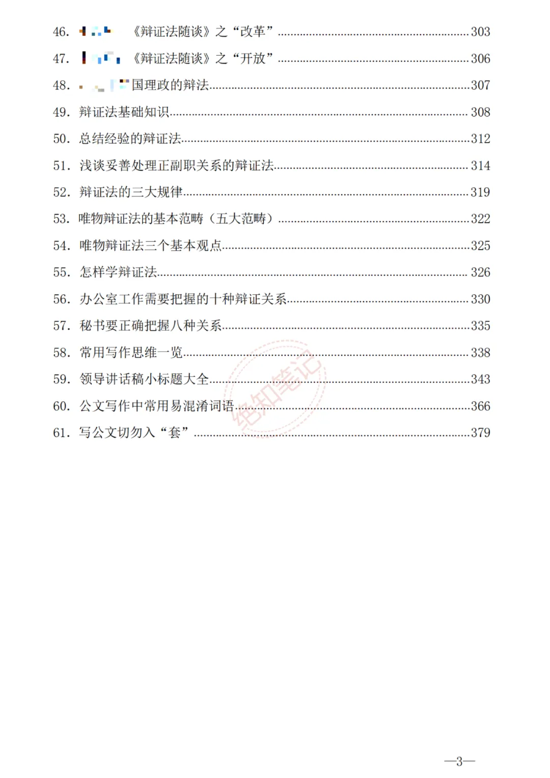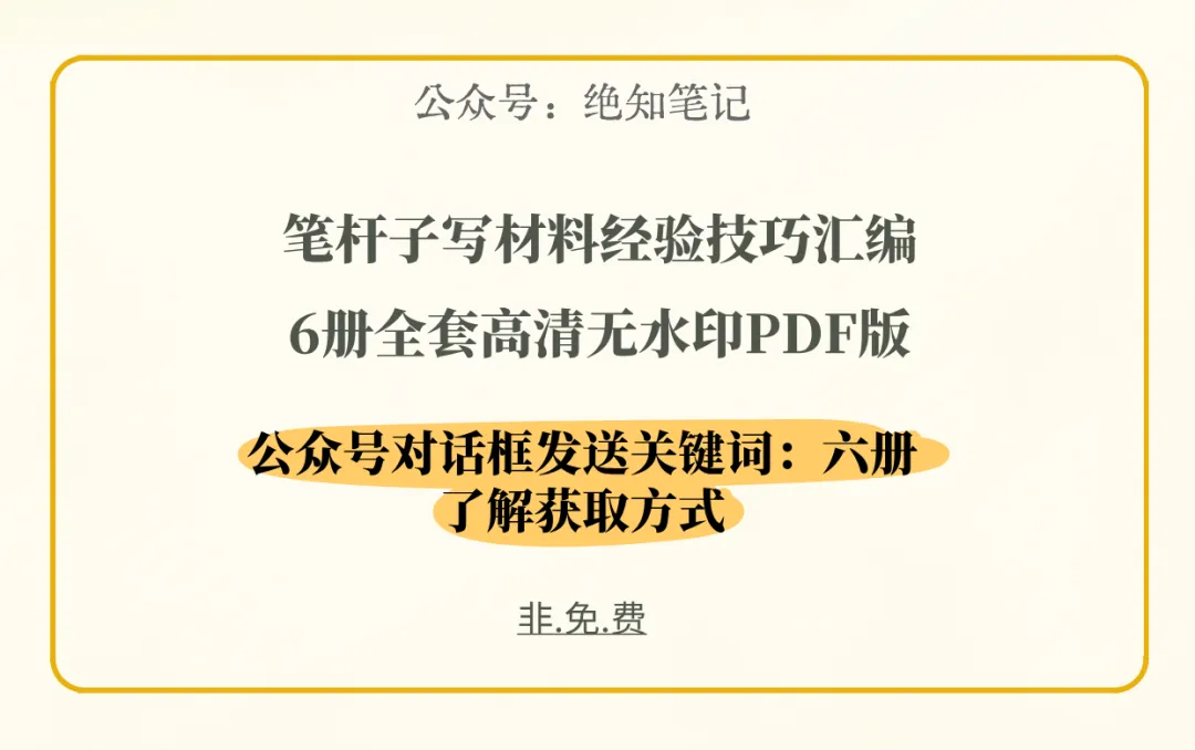 六册笔杆子写材料经验技巧汇编PDF版 今天绝知笔记为你带来一套内部自用的笔杆子写材料经验技巧汇编,内容非常丰富全面,它汇集了众多资深笔杆子的宝贵经验,既有思维方法、实战技巧,又有具体文稿写法,从理念到实操一应俱全,堪称写材料宝典。 该汇编一共6册,合计200多万字,2500多页,PDF电子版,高清无水印,可随身阅读。适合体制内材料岗、考公以及想要提升公文写作水平的各位朋友参考学习。 下面是目录及部分内容展示: