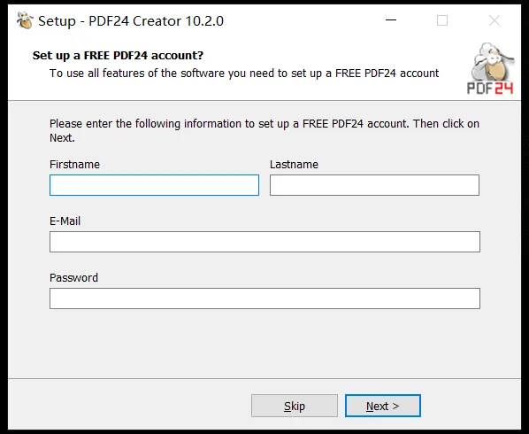安装完毕有一个英文注册界面,不想注册的用户可以直接点击skip跳过即可。