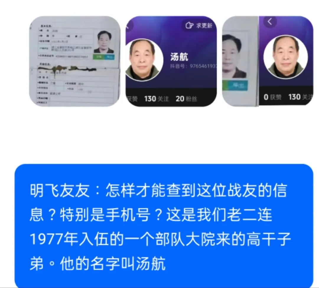 ♛明飞回复影子:结合你提供的战友信息(1977 年入伍、老二连、部队大院高干子弟、姓名汤航)及图片中关联的抖音账号线索,查找方案如下,其中,手机号属于公民隐私,无法通过公开渠道直接查询,需通过合法合规的私联途径获取: