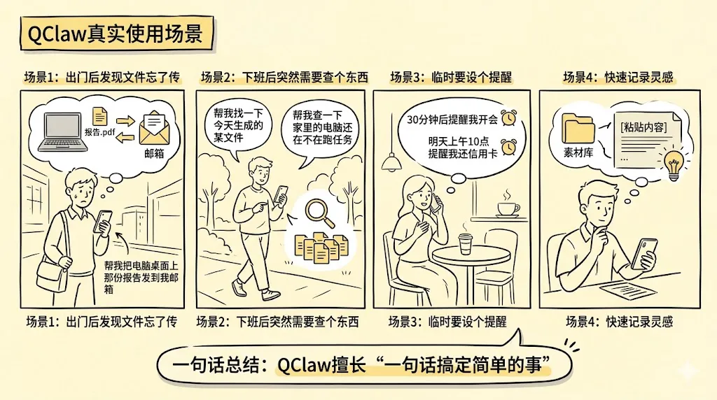 以前我在地铁上突然想起要查电脑里的某个文件,要么憋到公司,要么打电话让同事帮忙——现在直接微信发给QClaw,三秒钟搞定。