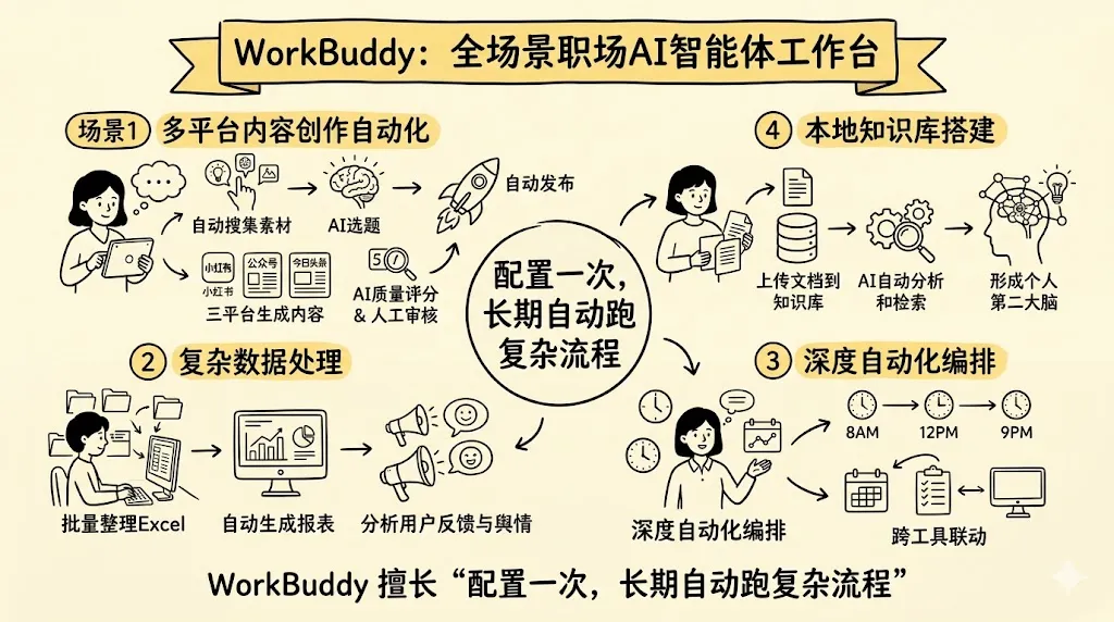 一句话:WorkBuddy擅长”配置一次,长期自动跑复杂流程”。