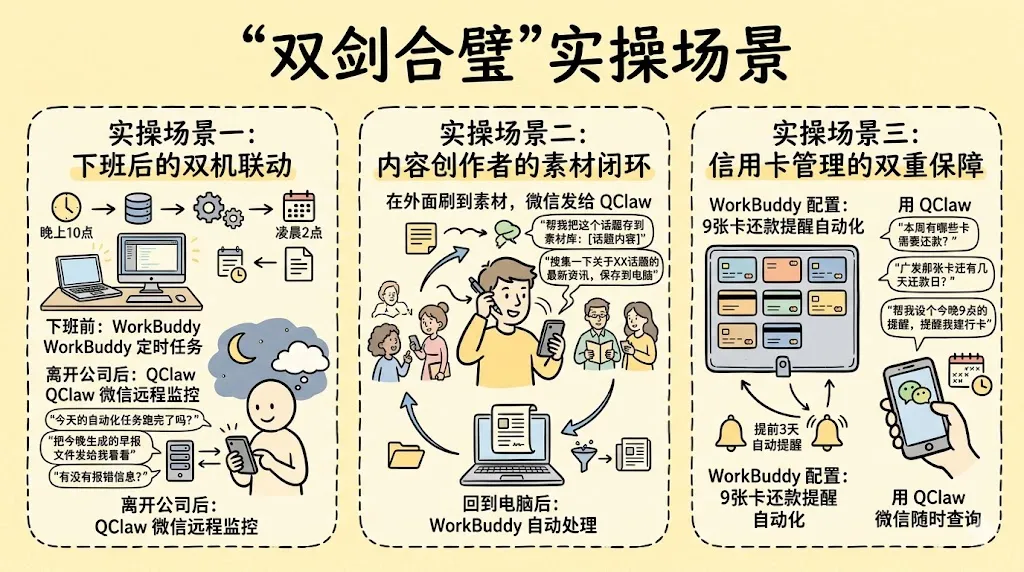 人在电脑前 → WorkBuddy深度执行人离开电脑 → QClaw微信遥控触发具体怎么用?