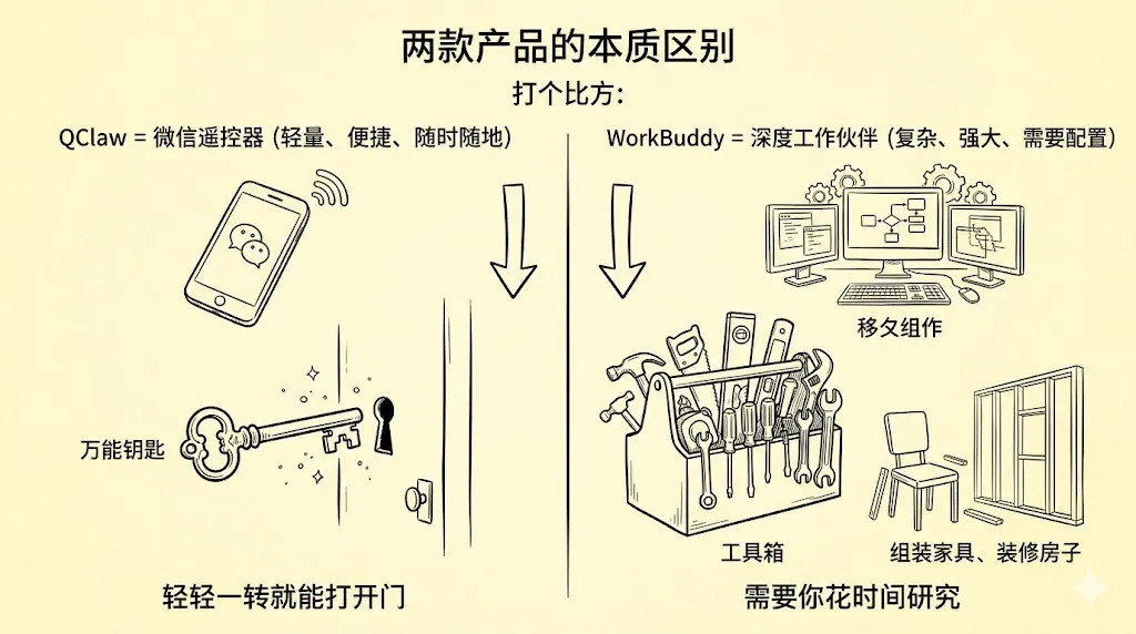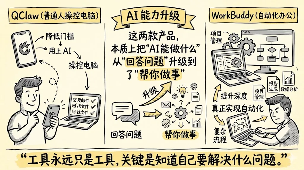QClaw把门槛降到最低,让任何人都能用微信遥控电脑; WorkBuddy把深度拉到最高,让愿意折腾的人能真正实现自动化办公。