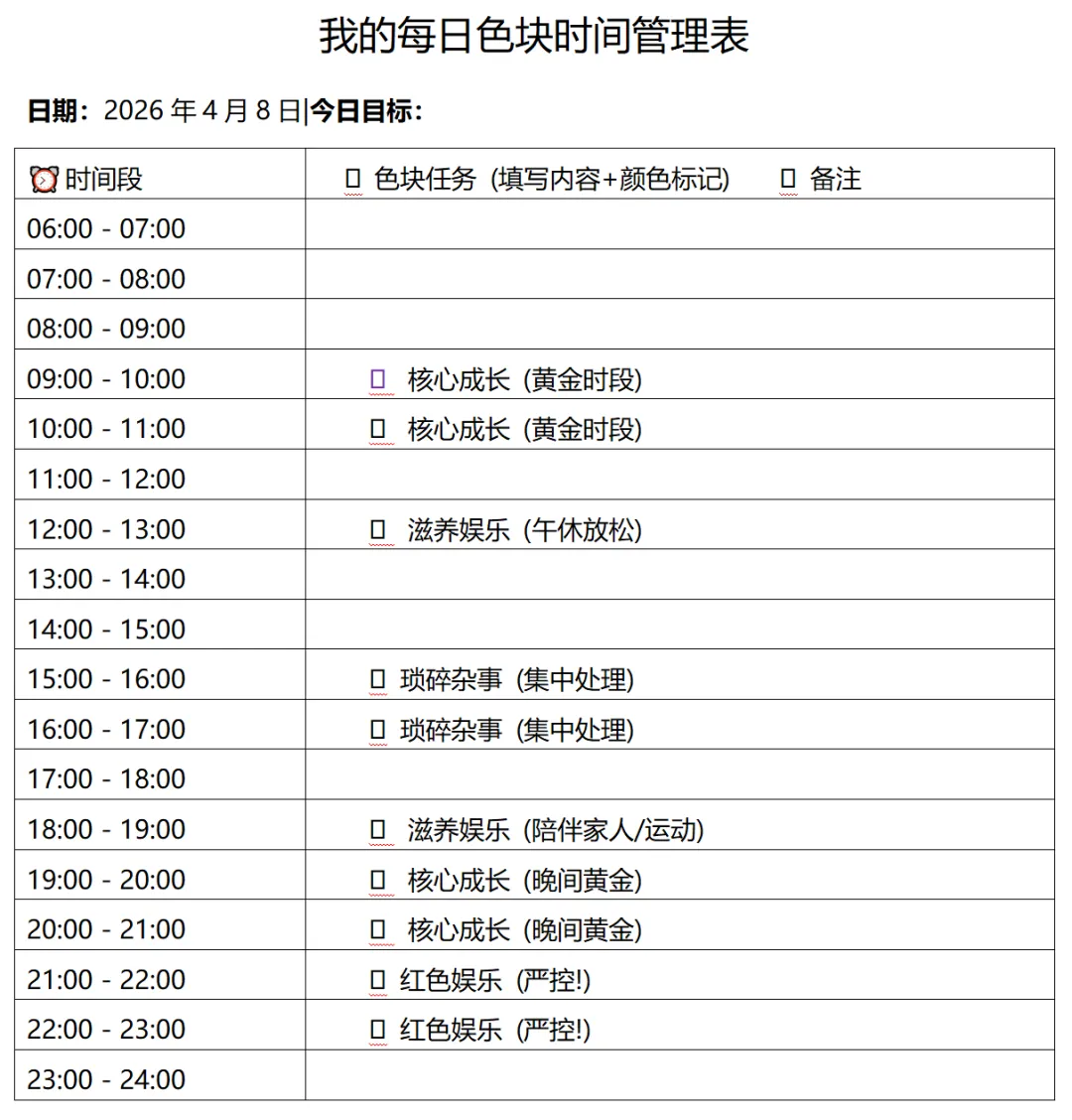 早上花5分钟,把当天要做的事,按颜色分配好时间段,写在日历/本子上,明确什么时间该做什么事。先填紫色(核心成长),再填蓝色(杂事集中做),安排绿色(主动放松),控制红色(别放纵)。