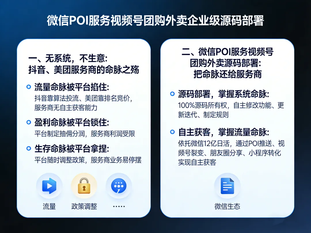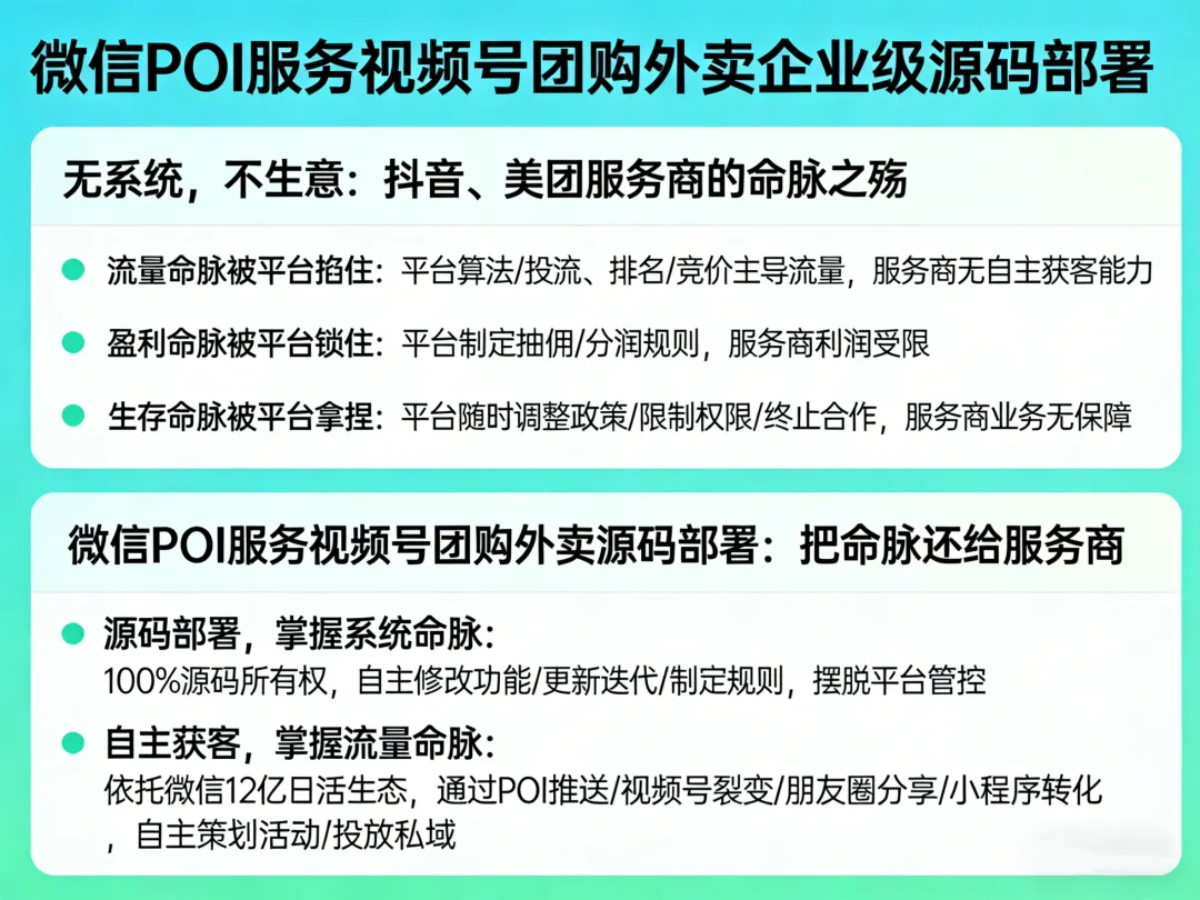 微信POI服务视频号团购外卖企业级源码部署,是专门为抖音服务商、美团运营商打造的自主系统解决方案,从根本上解决“命脉被掐”的问题,把系统主权、流量主权、盈利主权全部还给服务商。