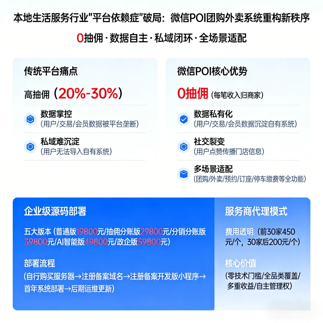 传统团购平台的收割模式终将被淘汰,私域化、自主化、低成本的微信POI服务,将成为本地生活行业的主流选择。企业选择源码部署,就是选择长期主义,掌控核心资产,无限拓展市场;服务商选择代理模式,就是选择轻资产创业,低投入高回报,长期锁定红利;商家选择微信POI服务,就是选择0抽佣、数据自主,摆脱平台束缚,实现长效经营。