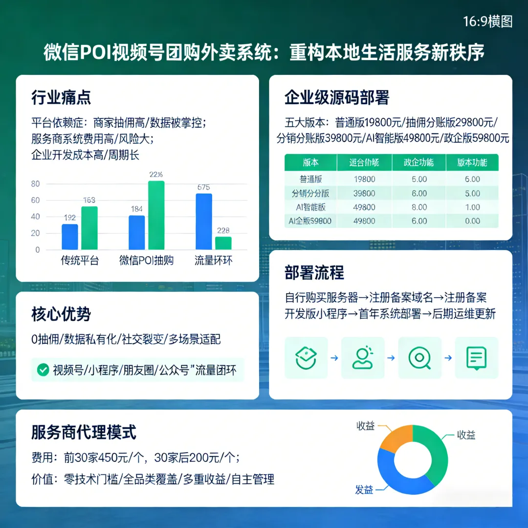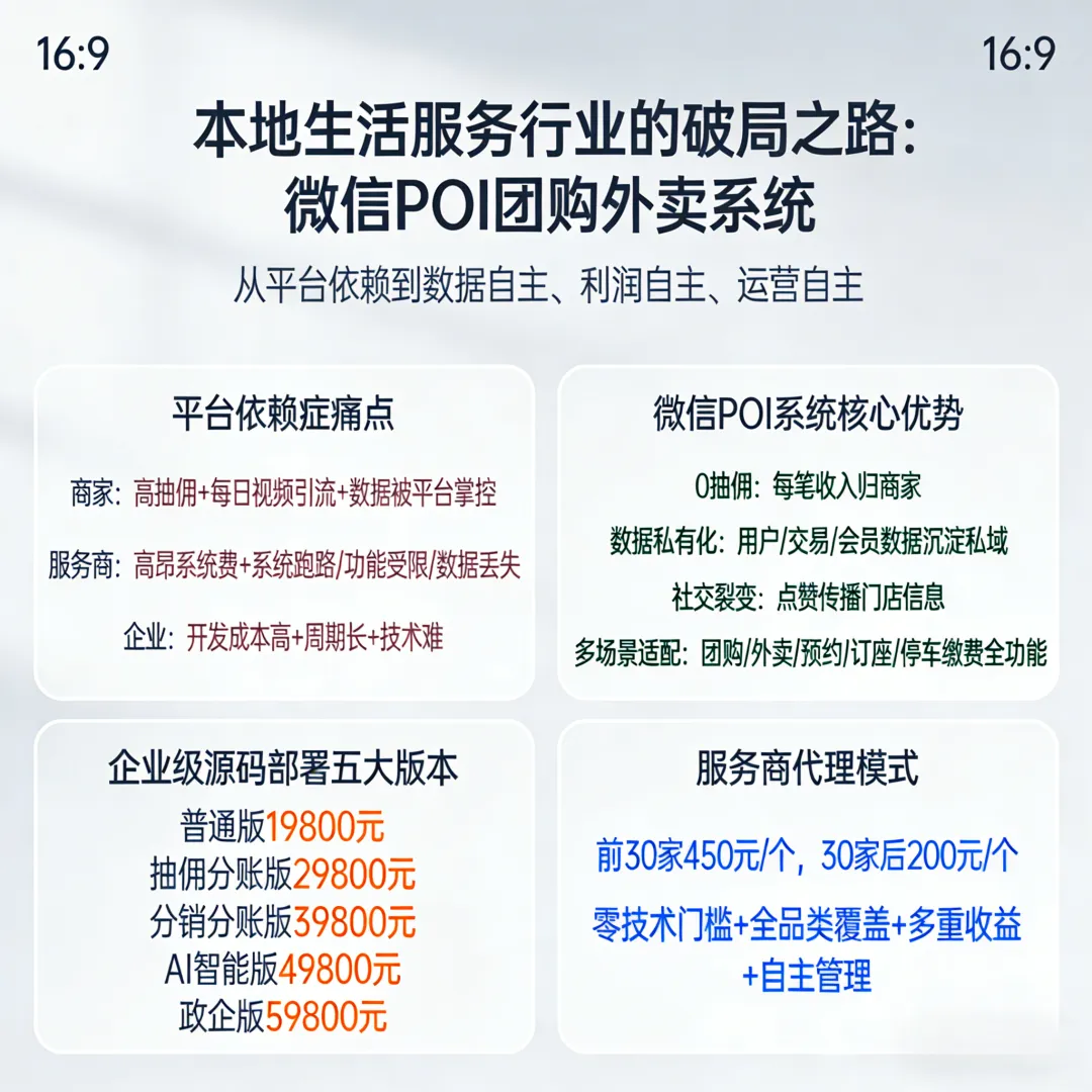 本地生活服务行业的“平台依赖症”,正在吞噬商家与服务商的利润与未来。商家入驻传统团购平台,不仅要支付高额抽佣,还要每日拍摄视频引流,数据完全被平台掌控,私域用户无法沉淀;服务商依附第三方系统,不仅要承担高昂的系统费用,还面临系统跑路、功能受限、数据丢失的风险;企业想要打造自有本地生活平台,却面临开发成本高、周期长、技术难的难题。2026年,微信POI视频号团购外卖系统横空出世,搭配企业级源码部署与服务商代理模式,彻底打破平台垄断,让商家、服务商、企业实现数据自主、利润自主、运营自主,重构本地生活服务新秩序。