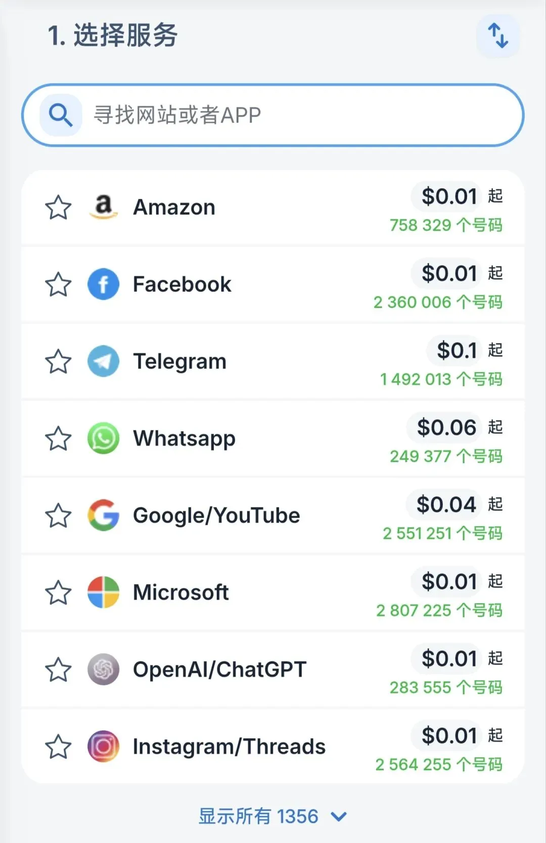 第二步:选择国家、服务(如Telegram、Google、OpenAI等),获取虚拟号码