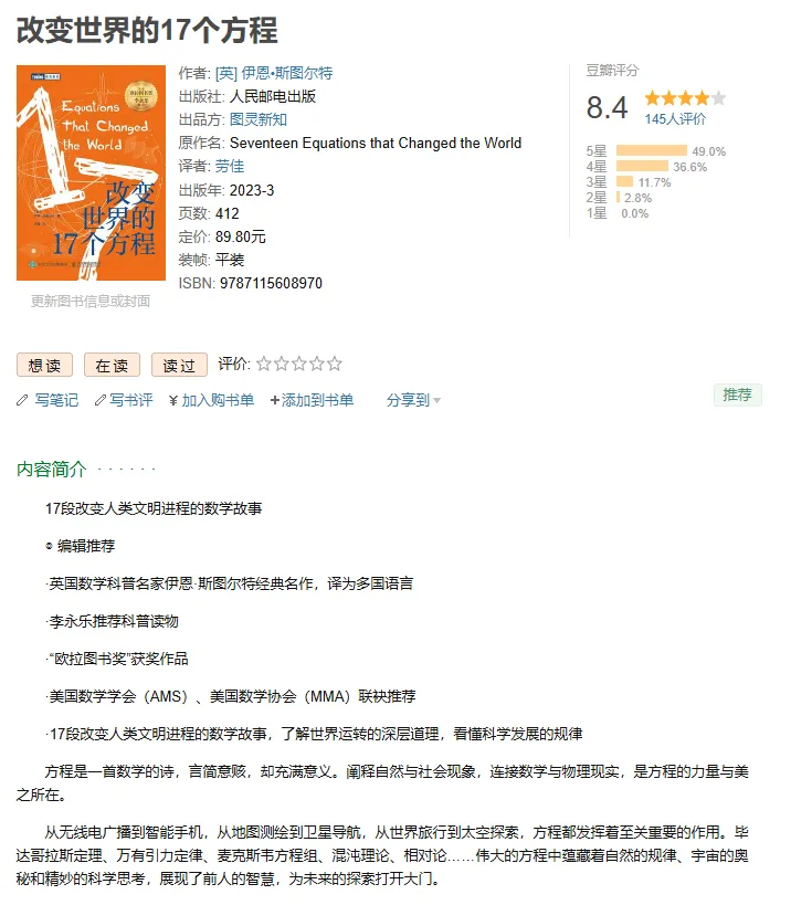 作者: [英] 伊恩•斯图尔特出版社: 人民邮电出版出品方: 图灵新知原作名: Seventeen Equations that Changed the World译者: 劳佳出版年: 2023-3ISBN: 9787115608970