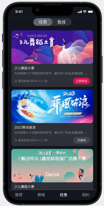 平台独创的”活动矩阵”功能尤为亮眼。即将开启的”少儿舞蹈大赛”已进入报名倒计时,家长可通过”立即报名”通道快速提交参赛视频,系统智能匹配评委打分与观众投票。而”2023乘风破浪”主题活动则通过”已报名”状态可视化,让参与者实时掌握赛事进程。这种”发现-参与-成长”的闭环设计,让每个舞蹈梦想都有实现的可能。