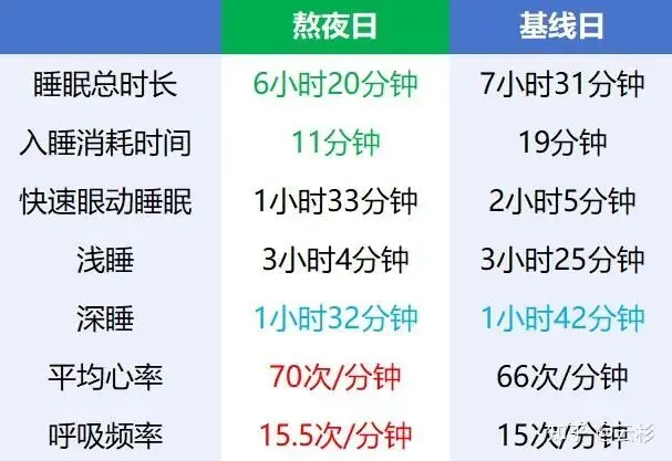 根据研究,急性熬夜会让身体优先保障深睡,压缩浅睡和快速眼动期,入睡潜伏期更短(入睡更快),平均心率和呼吸频率升高。