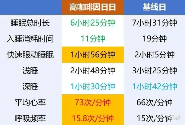 咖啡因可以让人入睡困难,深睡减少,心率、呼吸频率升高。[4] [5]