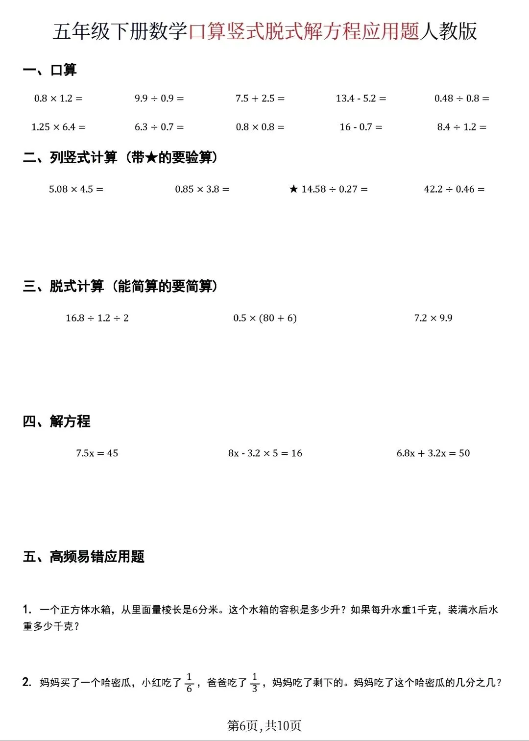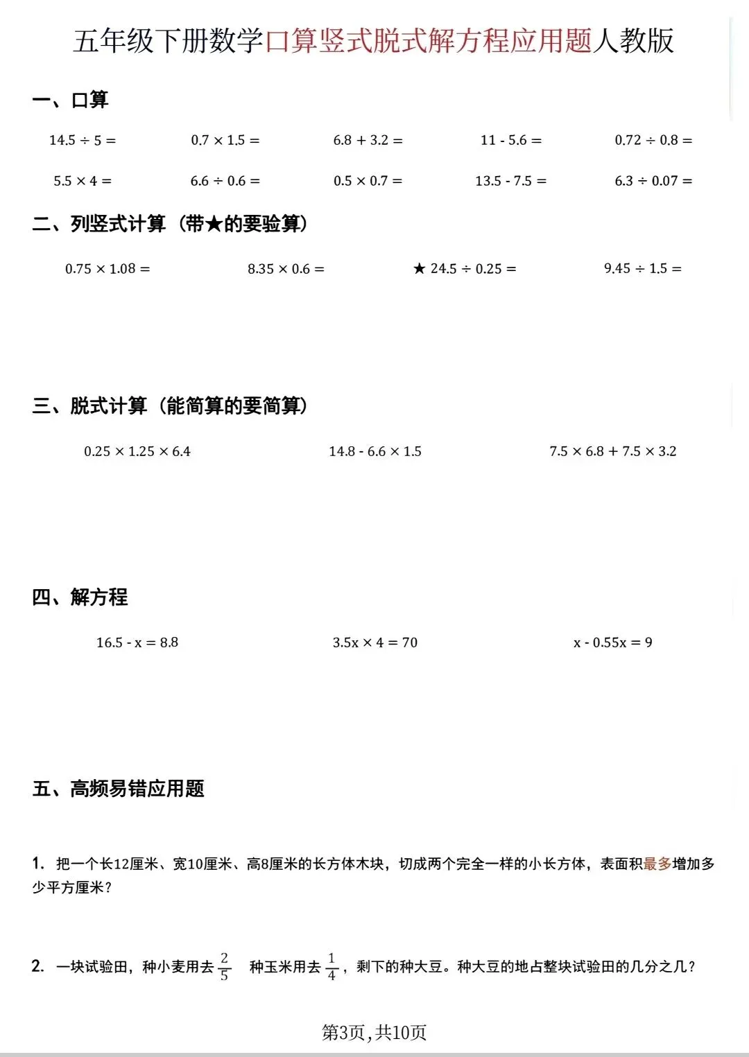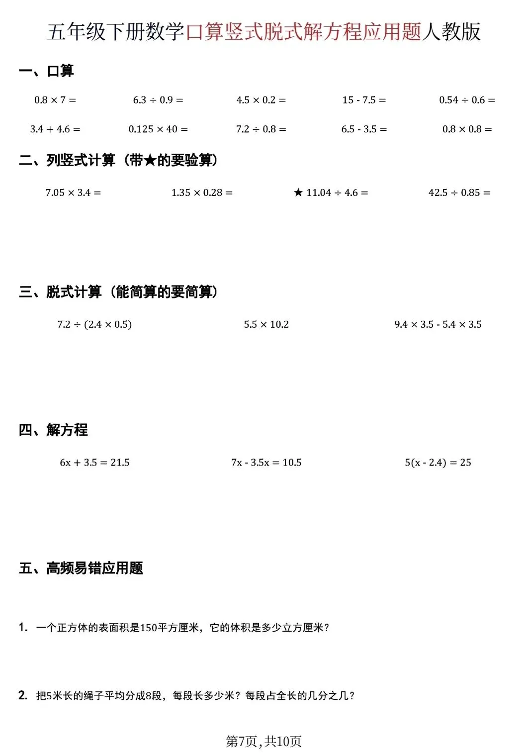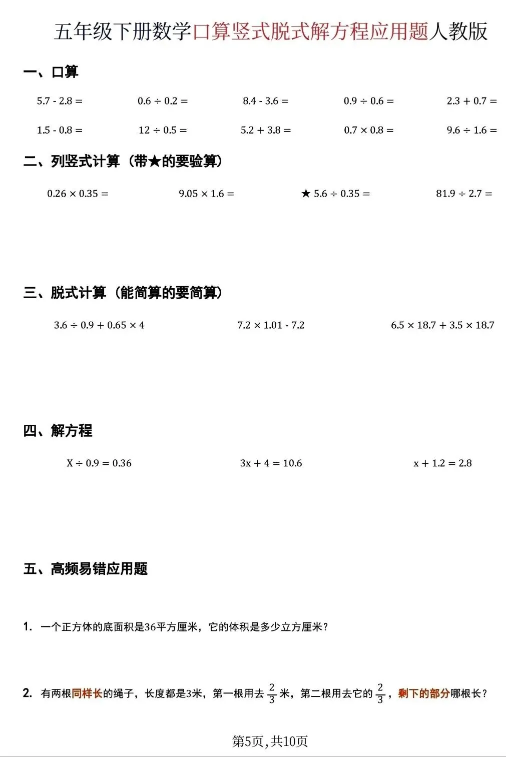 五年级下数学口算脱式计算解方程应用题(可打印)