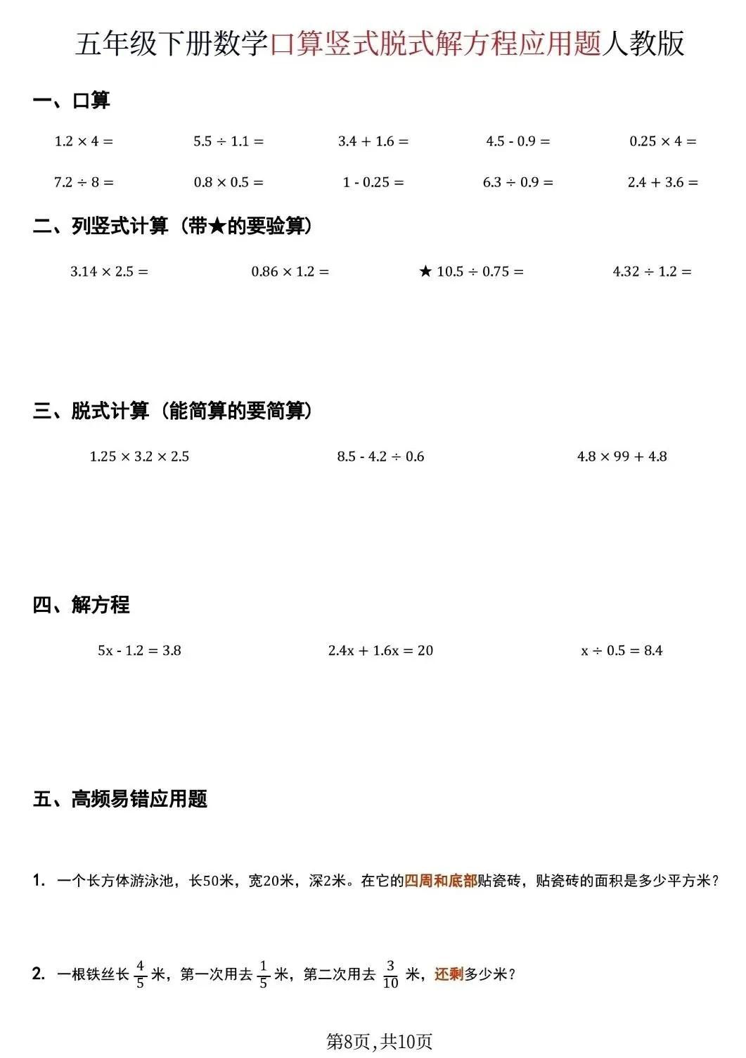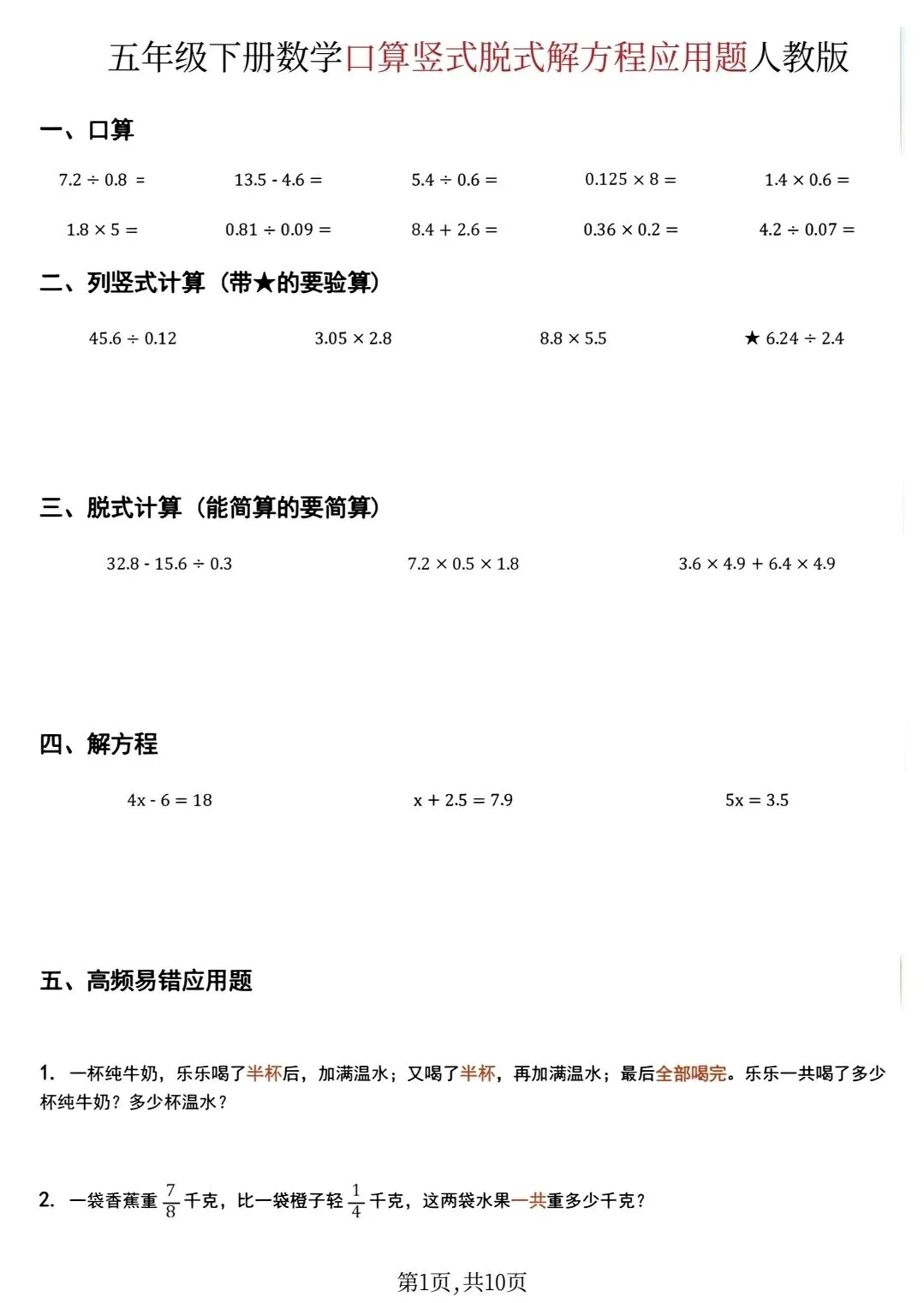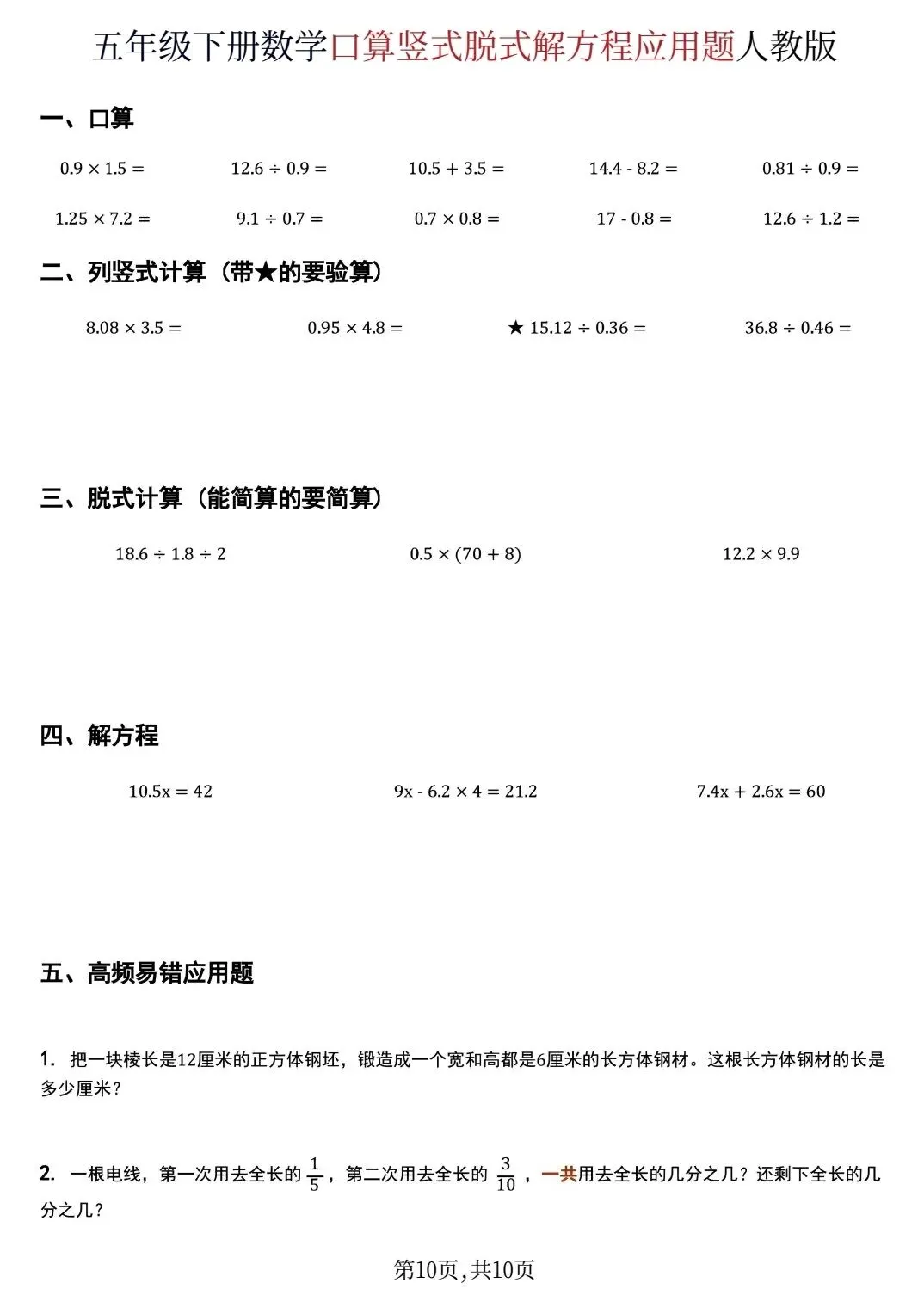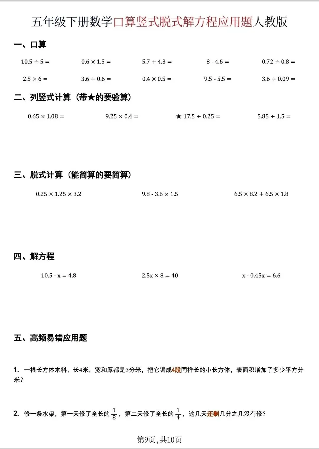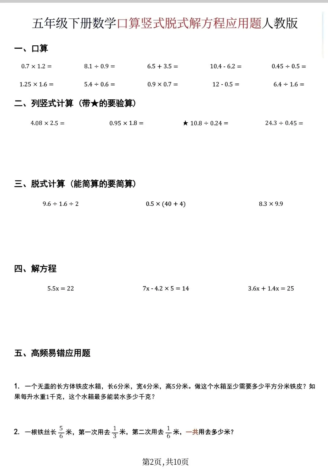五年级下数学口算脱式计算解方程应用题(可打印)