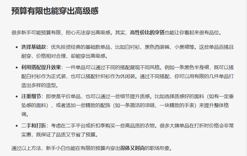 🏷️ 结尾话题标签: 包含了5个相关的热门话题标签,便于内容传播和被搜索到 这篇笔记既实用又有亲和力,非常适合职场新人阅读学习,帮助他们快速掌握职场穿搭的要点和技巧。 ![]() |