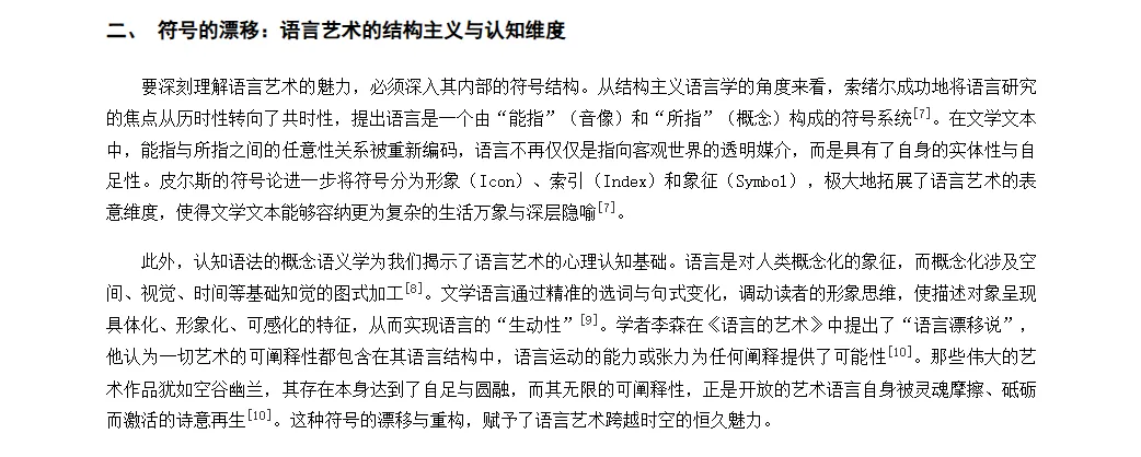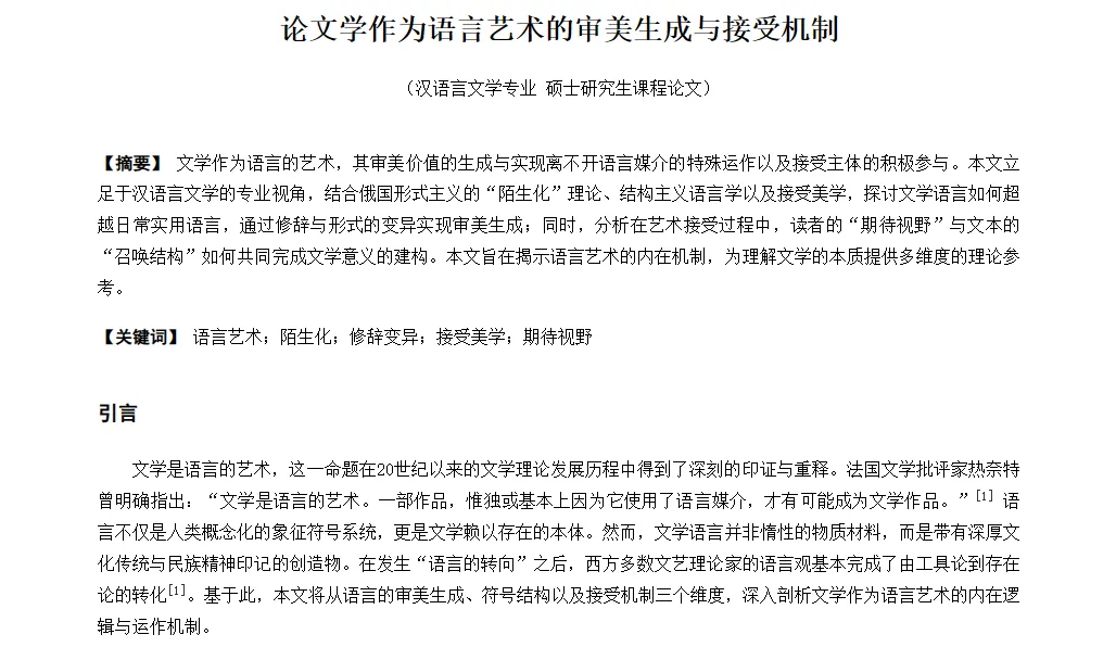 提示词: 我是汉语言文学专业的学生,请帮我写一篇关于语言艺术的论文,学历阶段为硕士,论文类型为学术小论文,字数约为2000左右。 📚 论文结构完整: