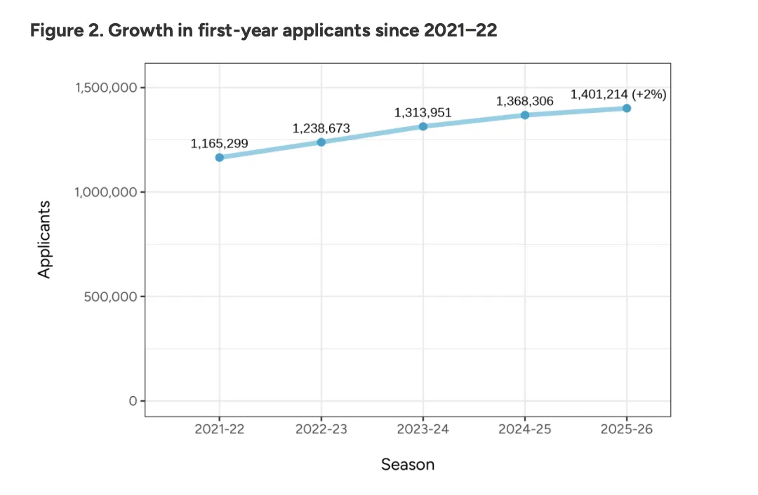 Common App(CA)发布的2025-2026申请季的最终数据复盘展示道:总申请人数突破140万大关,再创历史新高,但与此形成刺眼反差的是:国际申请者数量同比骤降9%。