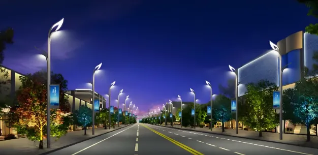 道路交叉口照明采用14米杆高三火路灯,灯杆中心距机动车道侧路缘石0.5米,灯具功率为3×280W(335W),灯具光源为LED灯。