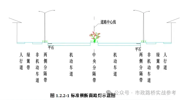 道路照明采用12米杆高双臂路灯在道路两侧侧分带对称布置,灯杆间距36米,灯具光源为LED灯,灯具功率:正常段180W+80W,渠化段240W+80W。灯杆中心距车行道侧路缘石0.75米。