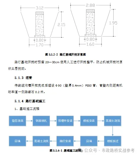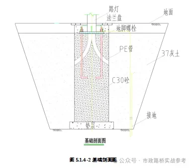 路灯基础开挖完成后对地基承载力进行检测,不小于120kPa,否则进行地基处理。整平后浇筑15cm后C15垫层。