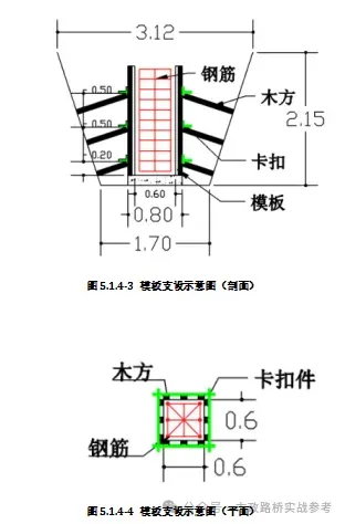 模板采用15厚木胶合板,次龙骨选用50×100木方@200mm。主龙骨选用成品火钩(步步紧)连接,后用50×100木方支撑于槽壁。