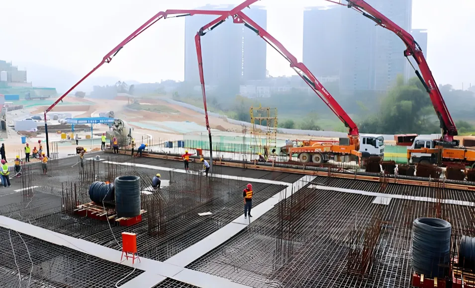 5、5#出料口由场外1台63m天泵泵送至拖泵中,再使用布料机进行收面;