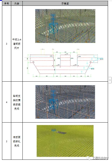 根据筏板图纸,大部分为四层附加水平钢筋网片,部分为三层。每层附加水平钢筋网片设置一层L63×5角钢与立柱焊接,作为水平连系构件,同时作为中间附加水平钢筋网片支架。底层角钢双向布置,其它层和槽钢横梁垂直单向布置。钢筋支架每隔4排立柱,纵横向设置由底到顶连续剪刀撑,剪刀撑采用L63*5角钢焊接固定在立柱上。