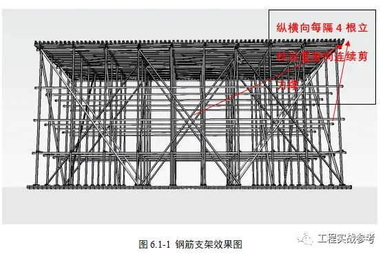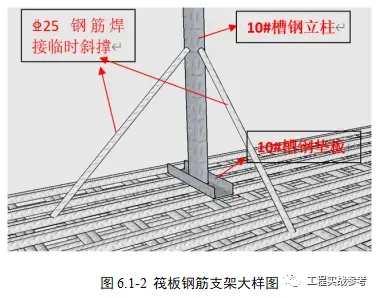 先把立柱和槽钢垫板焊接,采用两根25钢筋作为斜撑,对立柱进行临时固定,然后焊接底层双向角钢横杆将各立杆连接起来,绑扎完一层附加水平筋后,再进行上一层角钢横杆焊接及附加筋绑扎,最顶层附加水平钢筋绑扎后及时进行剪刀撑搭设,最后进行顶部横梁焊接及底板面筋绑扎。在洞口或变标高处顶部槽钢横梁断开,端部加设10#槽钢立柱。立杆与横梁、角钢焊接采用角焊缝双面满焊。焊缝等级三级。