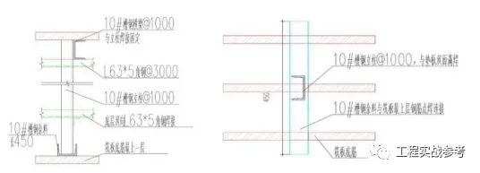 本工程主楼基础底板区域钢筋支架立杆采用10#槽钢作为立柱,纵横间距1000mm。立柱下端立于筏板底筋最上层钢筋之上,下端垫10#短槽钢(L=450mm)。顶部设置承受底板上皮钢筋重量及施工荷载的横梁,横梁双向布置,南北方向间距1000mm焊接一道10#槽钢,东西方向在立柱顶部间距3000mm焊接一道L63×5角钢,将槽钢支架横梁联系为整片。