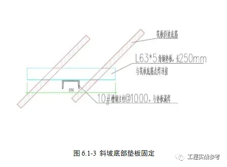 60°斜坡位置立柱焊接在角钢上,角钢规格为L63×5,长度为250mm,与底板钢筋点焊连接固定。详细做法见下图。