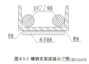 槽钢对接连接方式:采用直径不小于22mm的钢筋两根,长度不小于450mm,在槽钢内侧焊接;外侧采用6mm厚钢板,宽度为100mm,长度为不小于200mm进行四边满焊;槽钢对接处进行对焊焊接。见详下图。