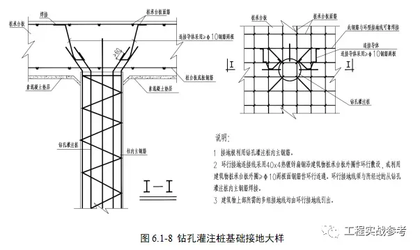 筏板主筋方格网状交叉绑扎,选择桩基的两侧各两根钢筋,和筏板底筋及面筋用连接导体(两根10钢筋)连接作为防雷接地。和主楼上部防雷接地系统连接。