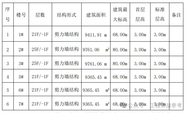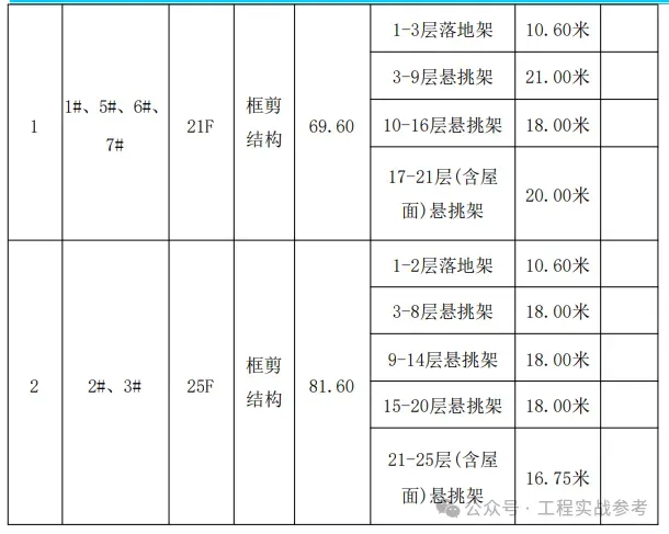 本项目包括6幢公寓楼和1幢商业配套办公楼,其中1#、5#、6#、7#楼为21层,2#、3#楼为25层,1幢6层商业配套办公楼,其中高层1#、2#、3#楼、5#、6#、7#楼自三层开始悬挑,共计三至四挑至屋面构架层,采用采用盘扣式悬挑脚手架,具体楼幢详见下表。