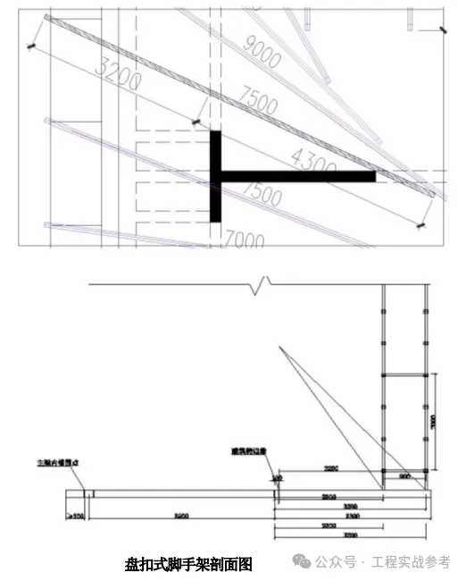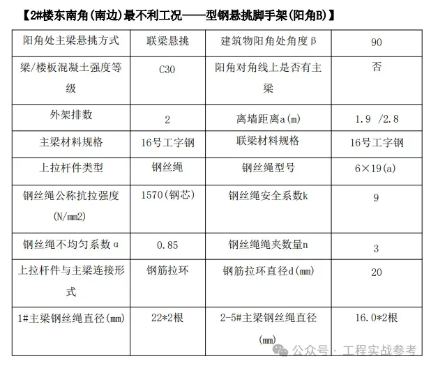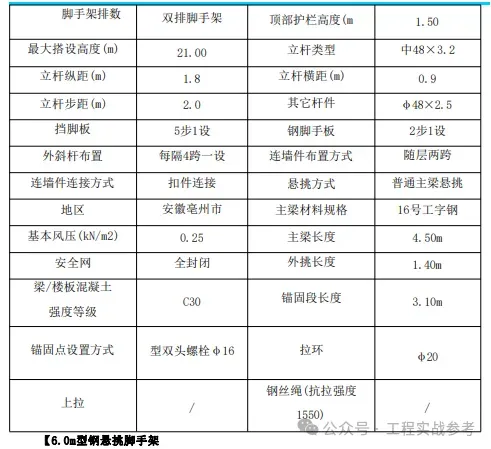 本工程悬挑式脚手架采用16#工字型钢悬挑梁、盘扣式双排钢管(φ48.3×3.2)脚手架,步距2.0m, 立杆纵向间距1.8m (最大值),立杆横向间距0.9m, 悬挑工字钢卸载钢丝绳采用6×19中14.0/15.5mm, 架体距离建筑物主体结构边0.30m (距建筑物主体结构距离超0.15m部位,采用层层增加填芯杆加兜网方式防护),连墙件随楼层两跨设置(两步两跨)。