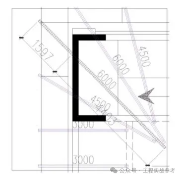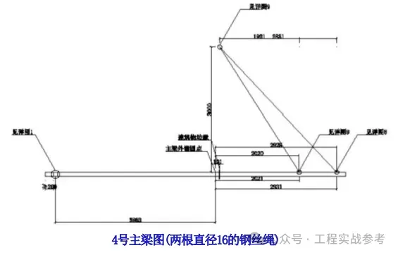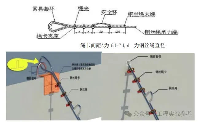3)做为安全储备及保障,对悬挑梁进行斜拉,吊环设置在上一层楼面边梁上,吊环采用020圆钢加工,锚固在砼内的长度不小于300mm,每根钢丝绳头不少于4个同规格的绳卡固定,每个绳卡间距女100mm, 端面留安全长度150mm, 卡盖朝主绳方向。悬挑处设置的上拉或下撑与工字钢角度尽可能保持在45°~60°之间,且应在立杆底部节点位置。