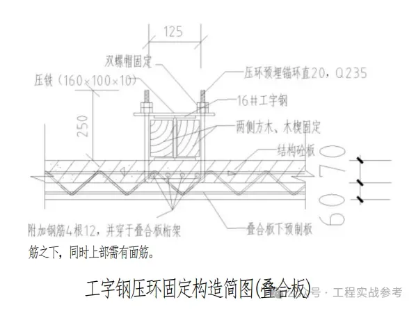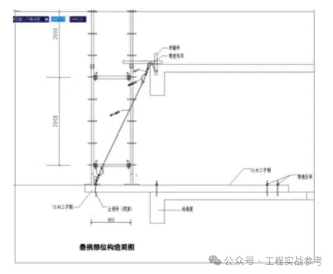 (1) 平铺式悬挑:砼浇筑前按方案设置直径20mm的U型锚固螺栓,砼浇筑后采用16#工字钢平铺悬挑出结构面。