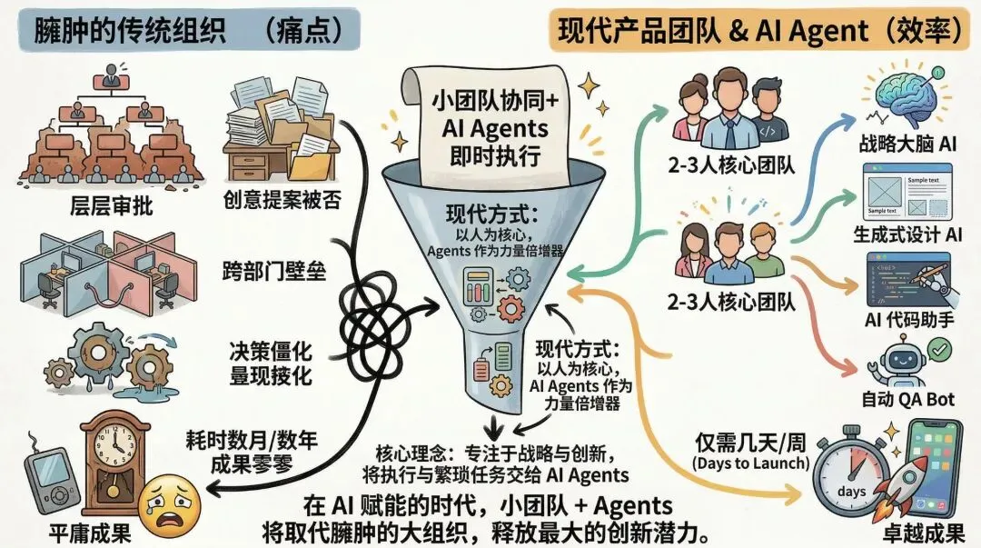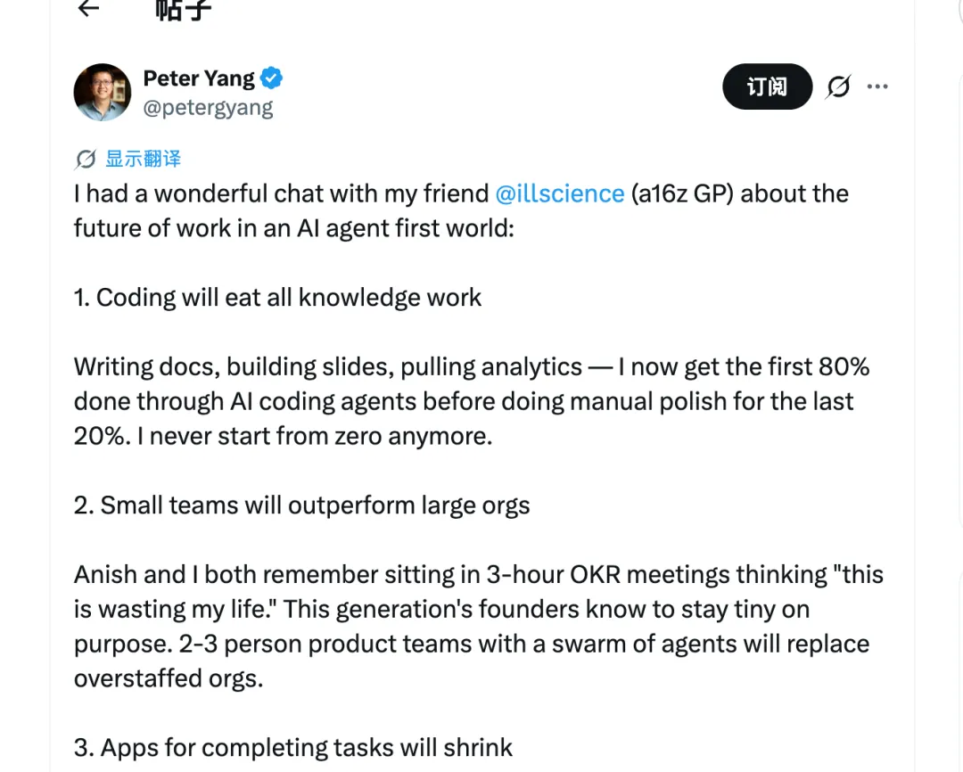 Peter Yang 的判断我特别认同:2-3 人产品团队 + 一群 AI agent,会取代臃肿的组织。