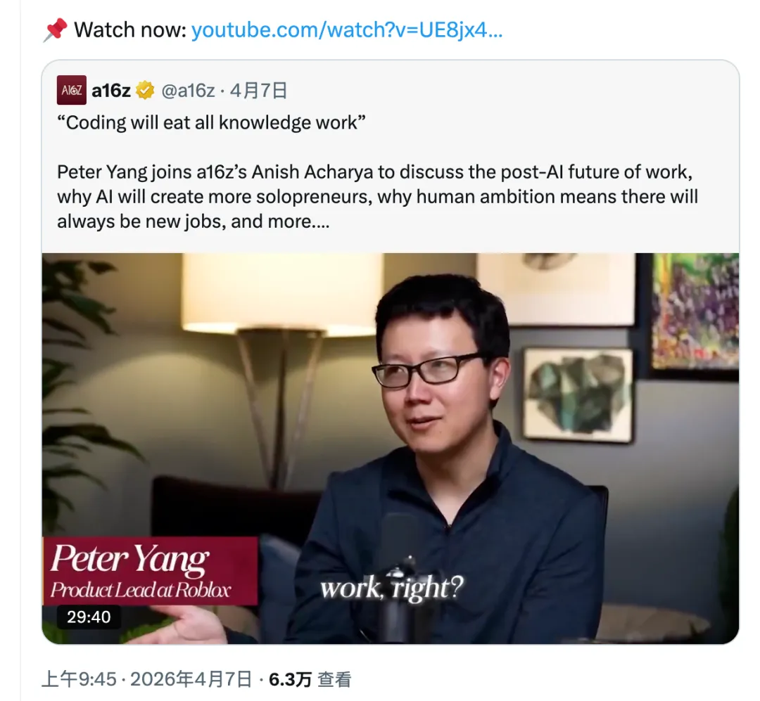 Peter Yang 和 Anish Acharya 的对话里有一句话我很喜欢: