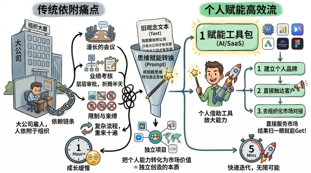 现在是:个人借助工具放大能力,绕开组织直接服务市场。